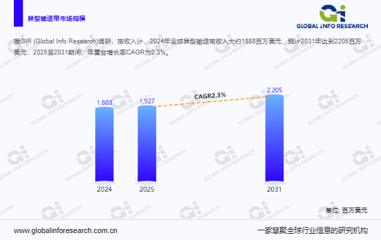 在物料输送与工业自动化领域,异型输送带凭借其定制化的结构设计与功能优势,成为解决特殊工况输送难题的关键设备,市场需求随工业细分领域发展而稳步增长。依据 GIR(Global Info Research)的调研数据,2024 年全球异型输送带收入约达 1888 百万美元,预计到 2031 年将增长至 2205 百万美元,在 2025 年至 2031 年期间,年复合增长率(CAGR)为 2.3%。这一稳健增长趋势,既反映出全球工业制造对高效、精准输送设备的持续需求,也凸显出异型输送带在矿业、建筑、港口等关键领域的不可替代性,未来市场潜力将随工业自动化升级进一步释放。